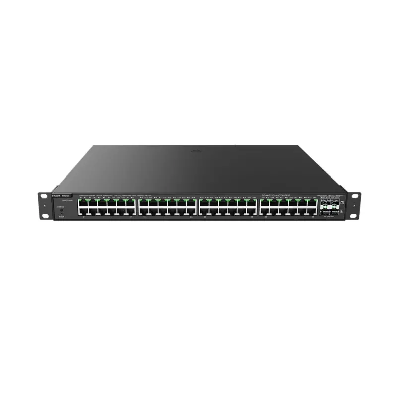 Efficient Layer 2 PoE+ switch with 48 high-power ports and 4 uplink SFPs. Featuring 370 W total PoE, advanced VLAN, QoS, ACL support, and 6 kV surge suppression. Manage with ease via web interface, Ruijie Cloud/mobile app, or SNMP—perfect for CCTV setups, campus networks, and SMB infrastructures.