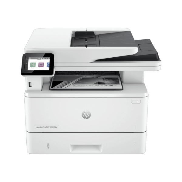 Unleash productivity with the HP LaserJet Pro MFP 4103fdw—an all-in-one monochrome laser printer offering up to 42 ppm, automatic duplex printing and scanning, a flatbed scanner, 2.7″ touchscreen, and seamless mobile connectivity—all in a compact and secure package designed for high-demand office environments.
